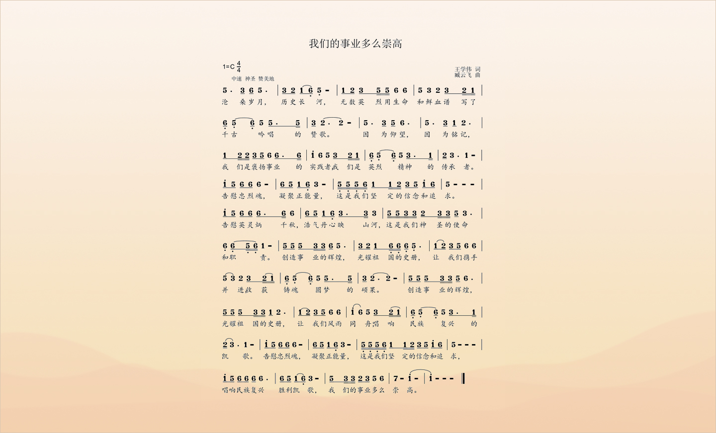 會歌旨在以永不消逝的旋律歌頌和銘記英烈事跡,傳承和弘揚(yáng)英烈精神。從歌詞到樂譜體現(xiàn)中華英烈不怕犧牲、不為艱險(xiǎn)的英雄氣概,深情謳歌中華英烈用赤膽忠心鑄就勝利榮光、捍衛(wèi)祖國尊嚴(yán)的偉大壯舉。歌詞簡約大氣,力求抒發(fā)中華英烈褒揚(yáng)事業(yè)的神圣和崇高。樂曲旋律深情飽滿、昂揚(yáng)豪邁,力求每一個(gè)音符都撞擊聽眾靈魂,切身感受中華英烈感動天地、氣壯山河的高貴品格,呼喚和感召世人傳承英烈志、凝聚民族魂、共圓中國夢。